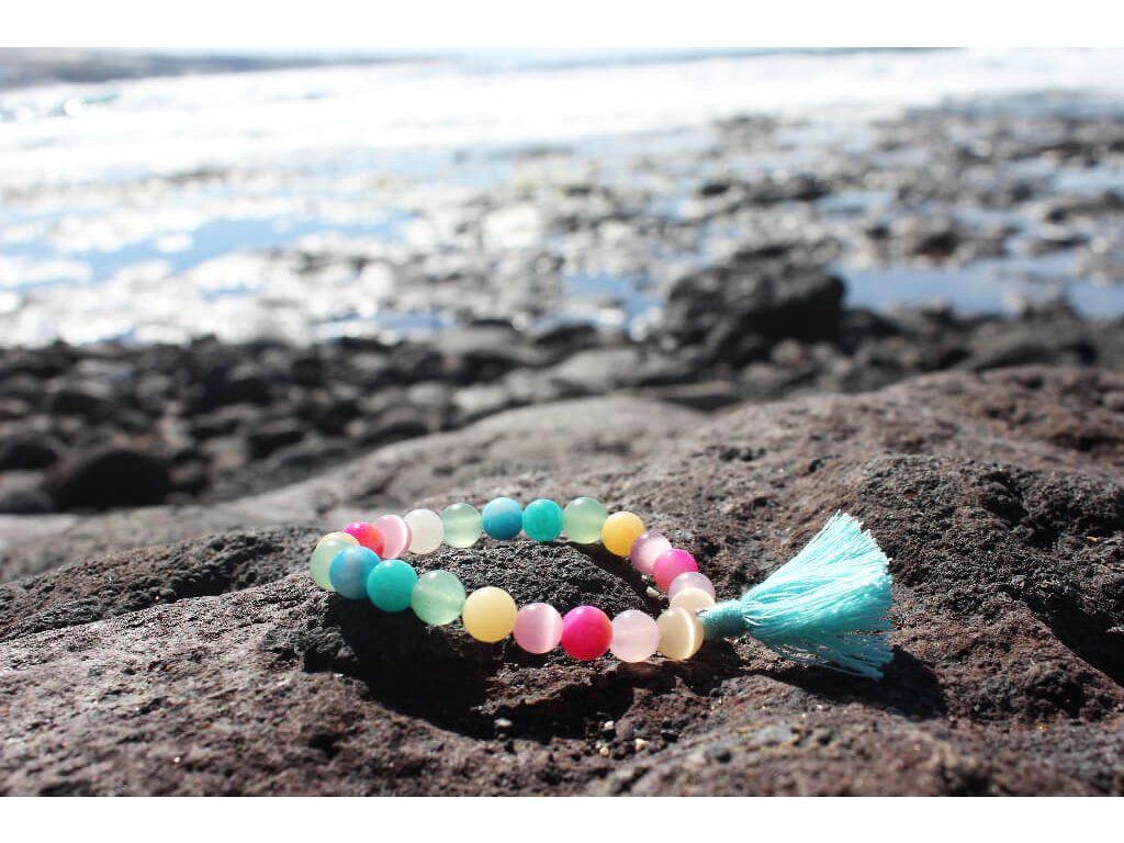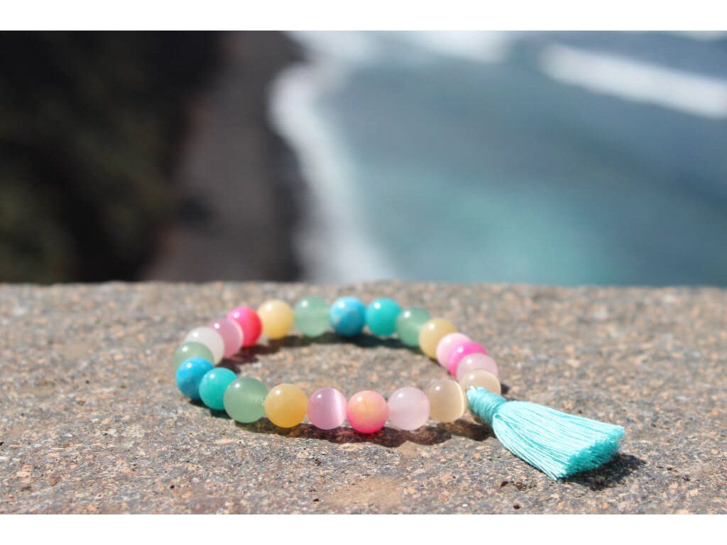 Když prší a zároveň svítí sluníčko je na obloze vidět duha, která v nás vyvolává pozitivní pocity. Tento obdivuhodný optický jev byl inspirací Duhovému náramku štěstí, který je tvořen minerálními kameny v pastelových duhových odstínech.