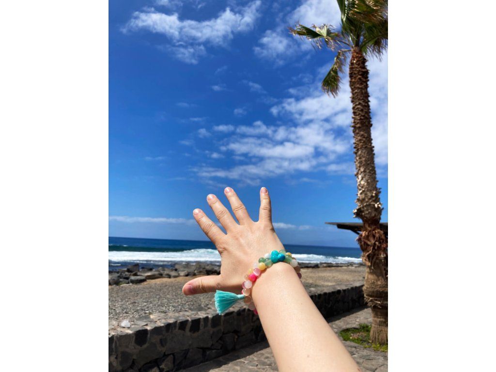 Korálky z minerálů jsou ve velikosti 7 -8 mm. Náramek zdobí ručně vyráběný tyrkysový střapeček a je vhodný na zápěstí o velikosti 16 -17 cm. Navléknuto na pevném elastickém vláknu. Zboží obdržíte v plátěném sáčku, který je ručně vyráběn na Bali.