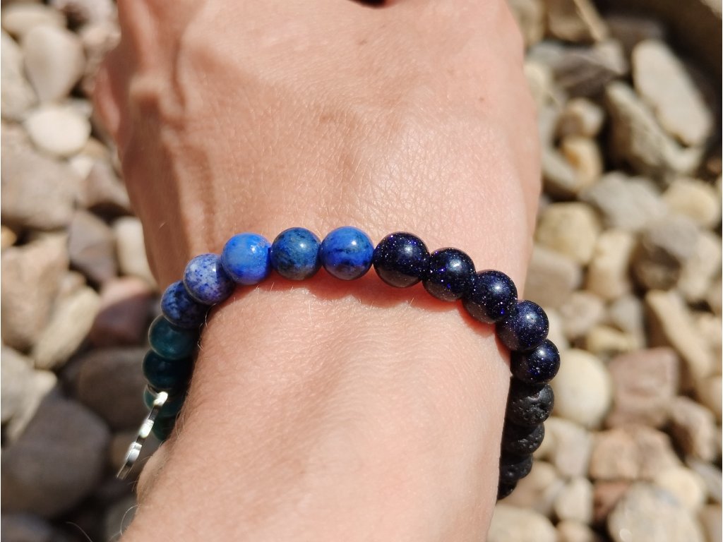 Syntetický modrý aventurín dodává jiskru – jako sluneční odlesky na hladině hluboké vody.