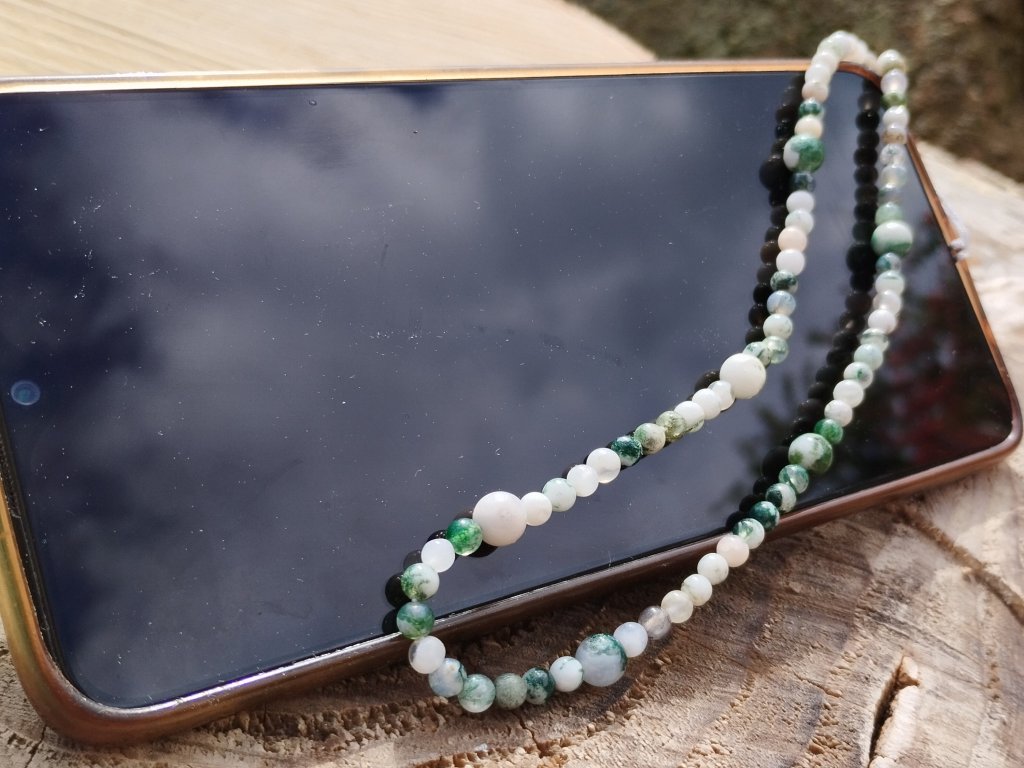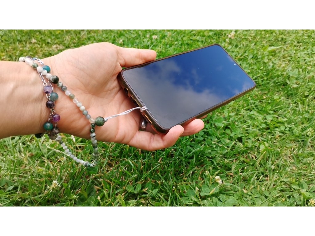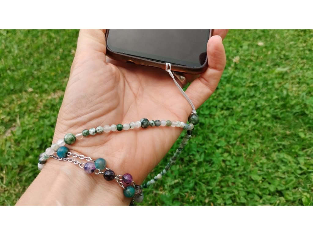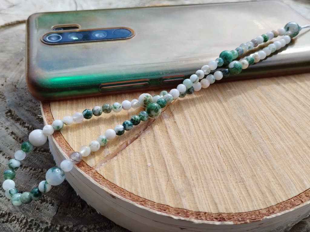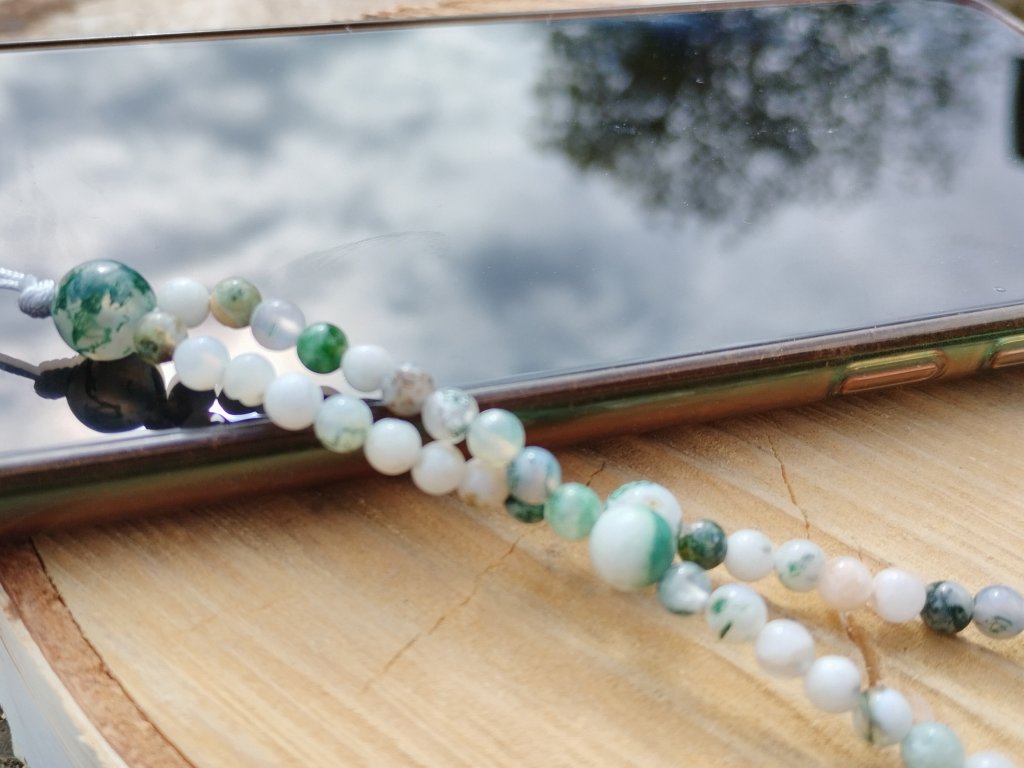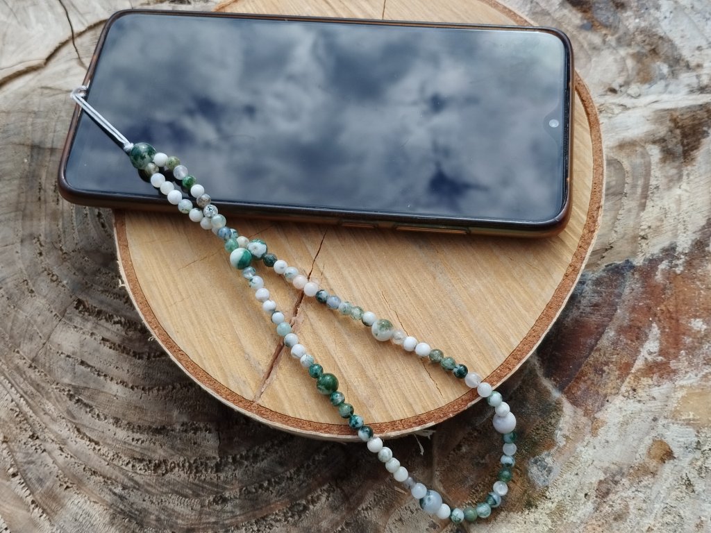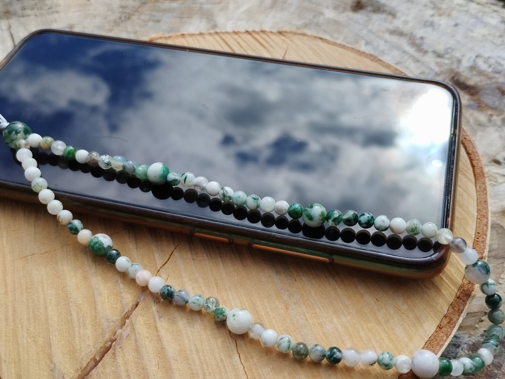 Minerální přívěsek/poutko na mobil ze stromečkového achátu – propojení stylu, praktičnosti a přírodní symboliky v jednom elegantním detailu.