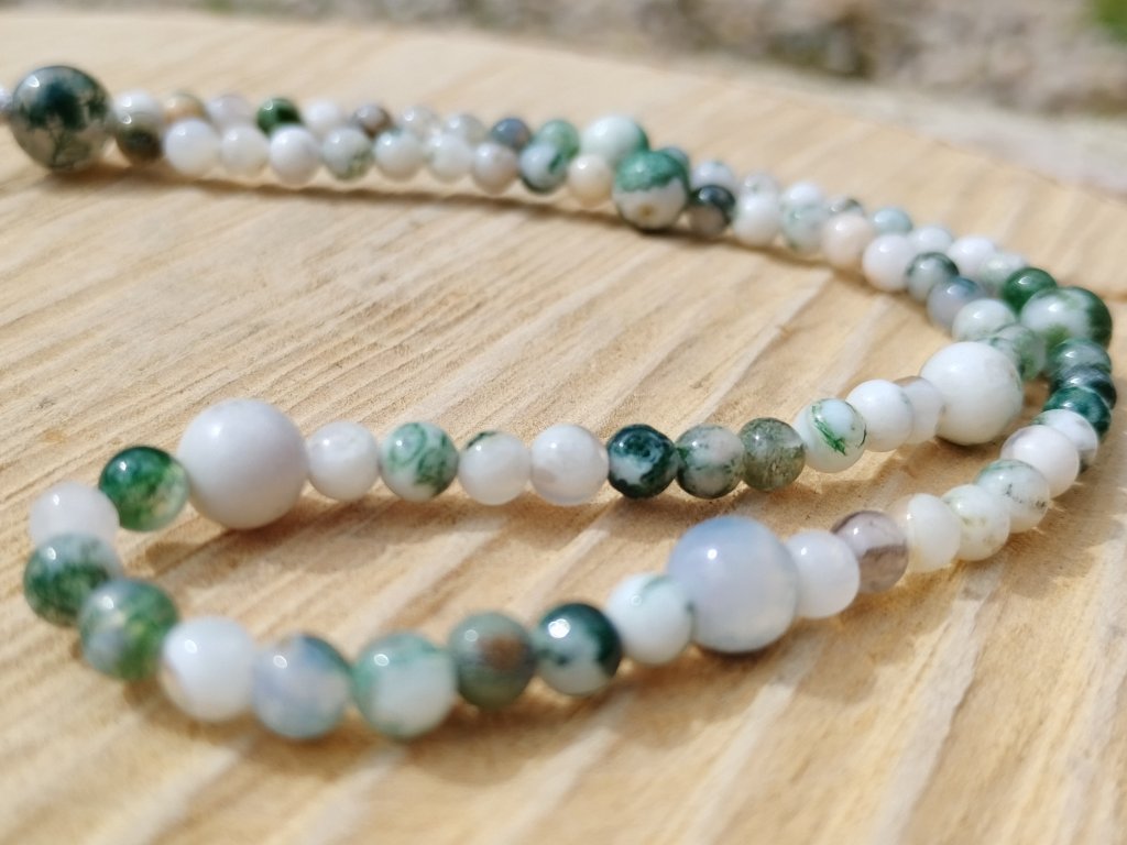 Nese jméno Kořeny v kapse– a není to náhoda. Tento přívěsek z jemného stromečkového achátu v odstínech bílé a zelené připomíná větvičky, lišejníky nebo tichý les po dešti. Každý korálek je originál, jako otisk přírody. Díky poutku ho můžeš nosit na mobilu, batohu nebo na klíčích a mít tak svůj klidný bod stále při sobě.