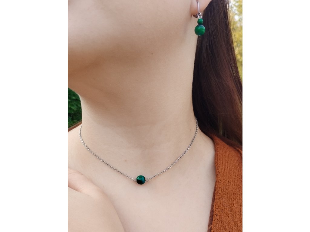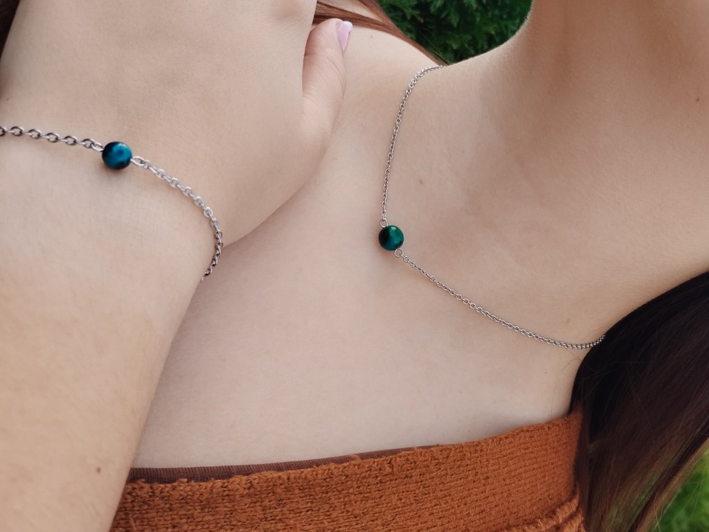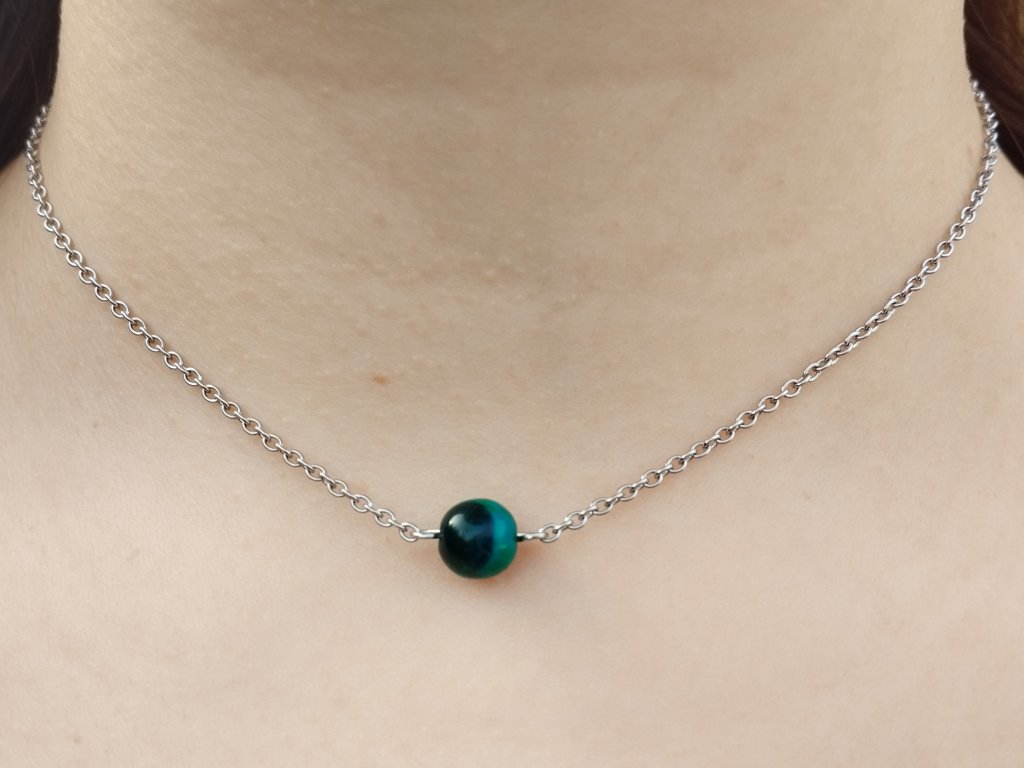 Náhrdelník Hlubina vznikl spojením minerálu chryzokol a řetízku z chirurgické oceli.