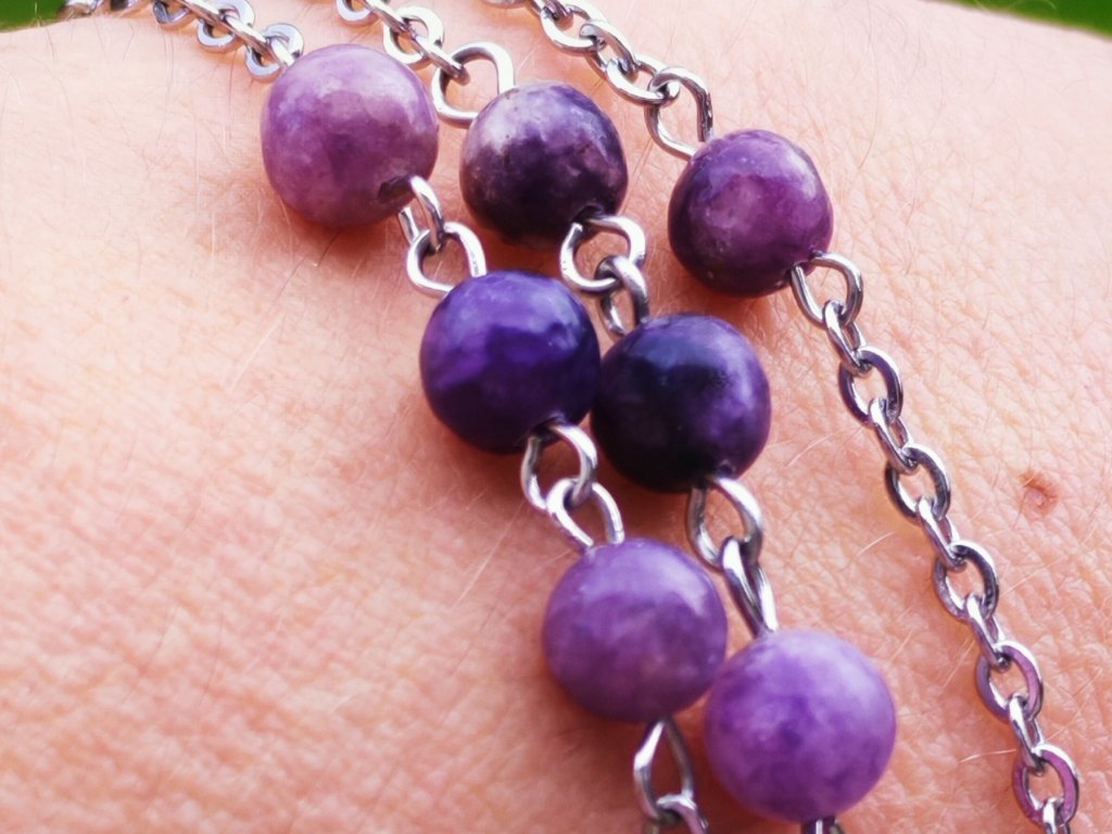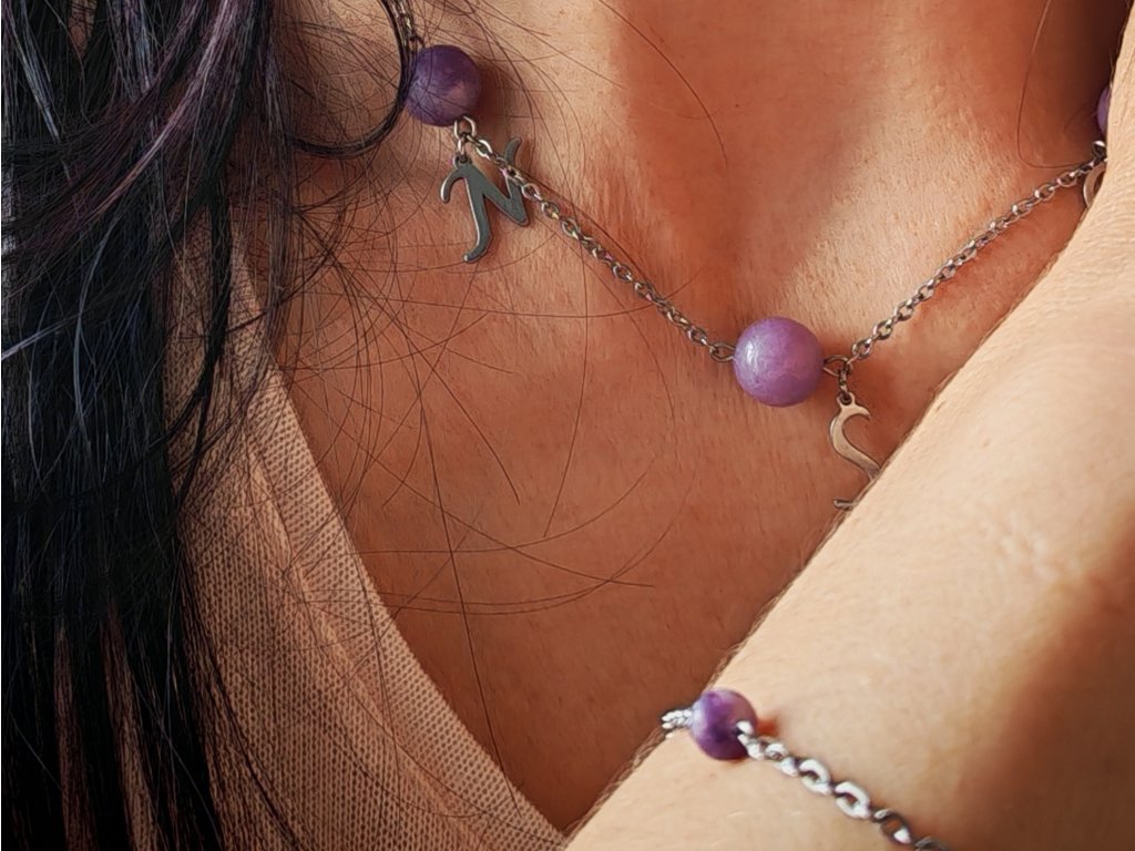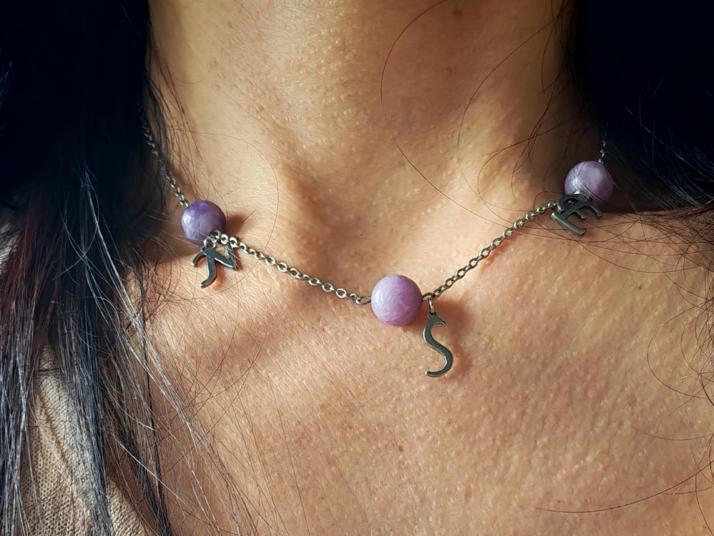 Právě tak působí náhrdelník Ticho v bouři. V jeho středu se třpytí lepidolit, kámen jemnosti, nadhledu a proměny. Každý odstín fialové se v něm mění podle světla, jako by dýchal s tebou.