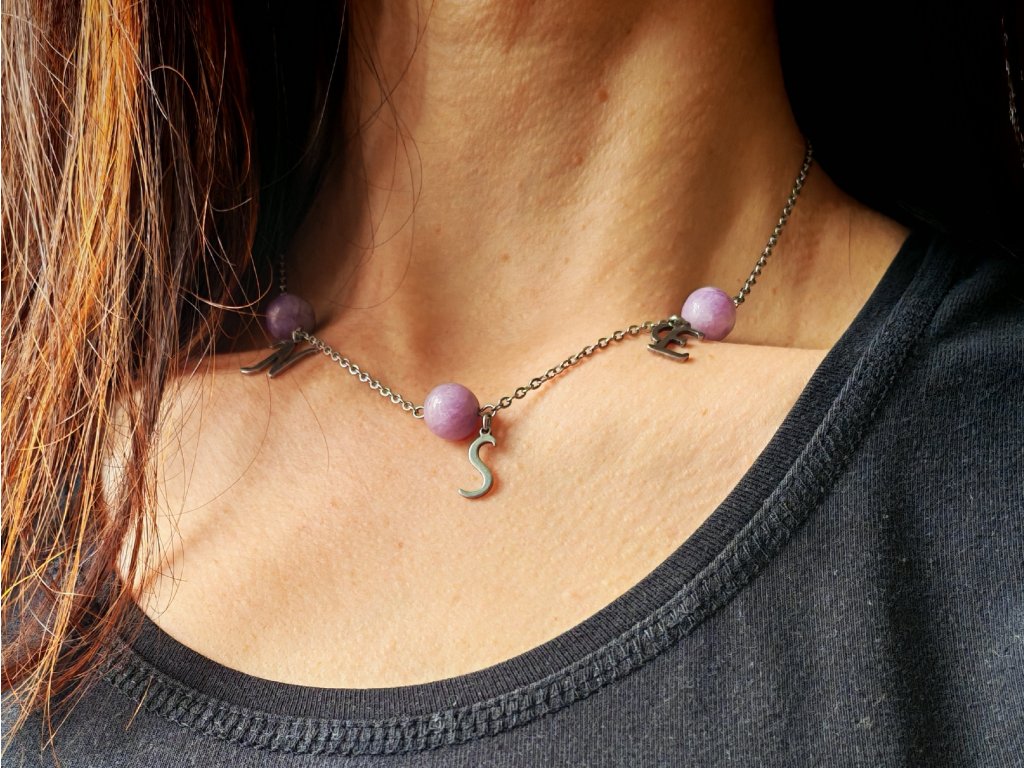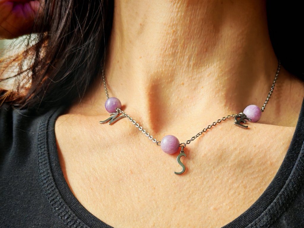Minimalistický minerální náhrdelník z chirurgické oceli s lepidolitem – symbolem klidu uprostřed chaosu.