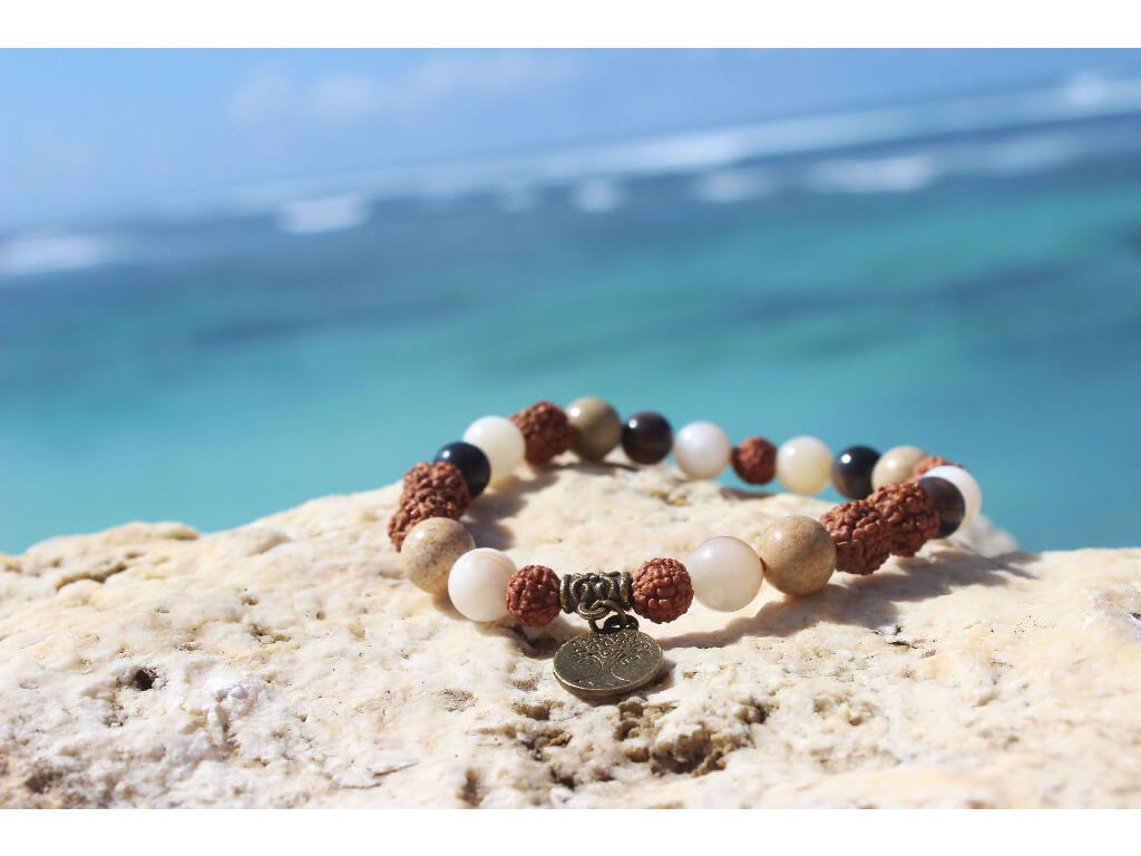 Náramek je dále tvořen z minerálních korálků z tmavé a světlé mušloviny s perleťovými odlesky, které jsou nabité pozitivními vibracemi a působí jako talismany s energií moře.