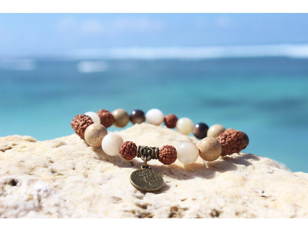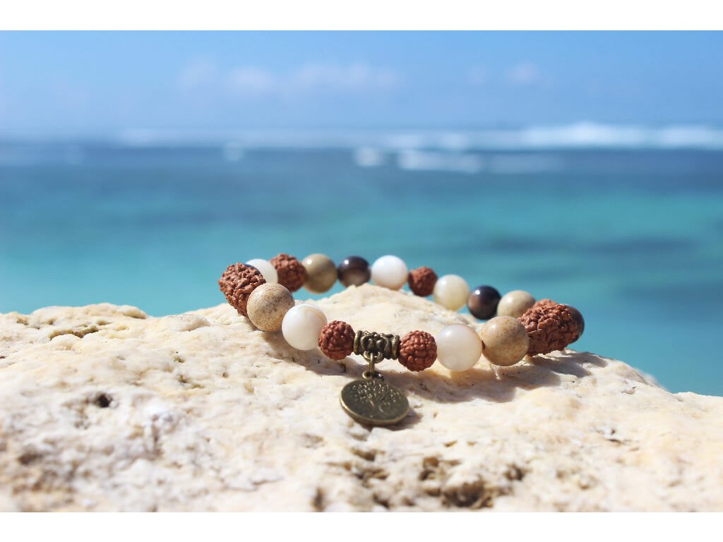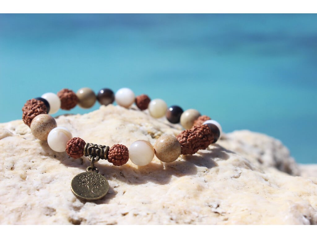 Minerální náramek v zemských tónech z minerálních kamenů a semínek rudraksha zdobí přívěšek s oblíbeným symbolem stromu života, který ztělesňuje stvoření, stabilitu a život.