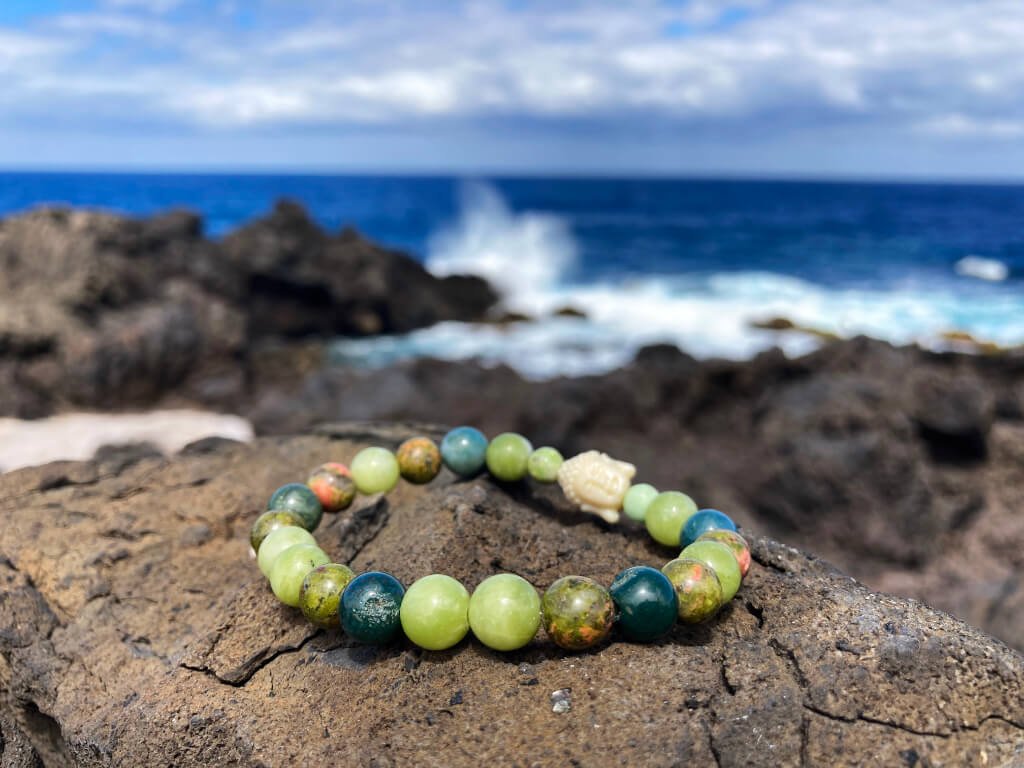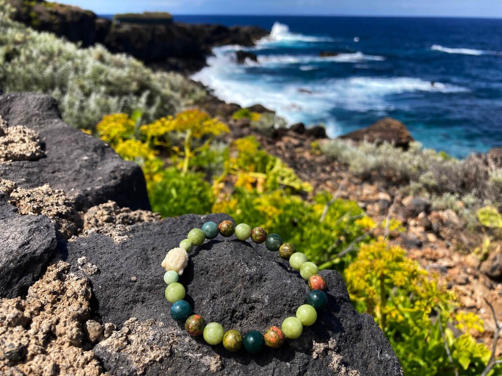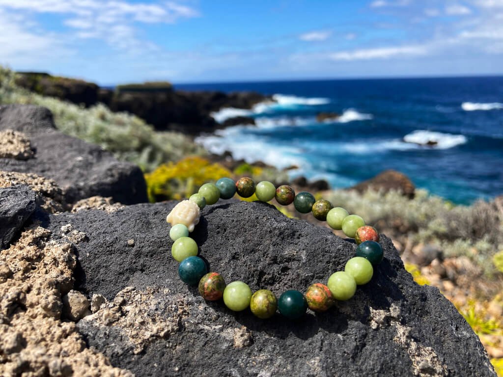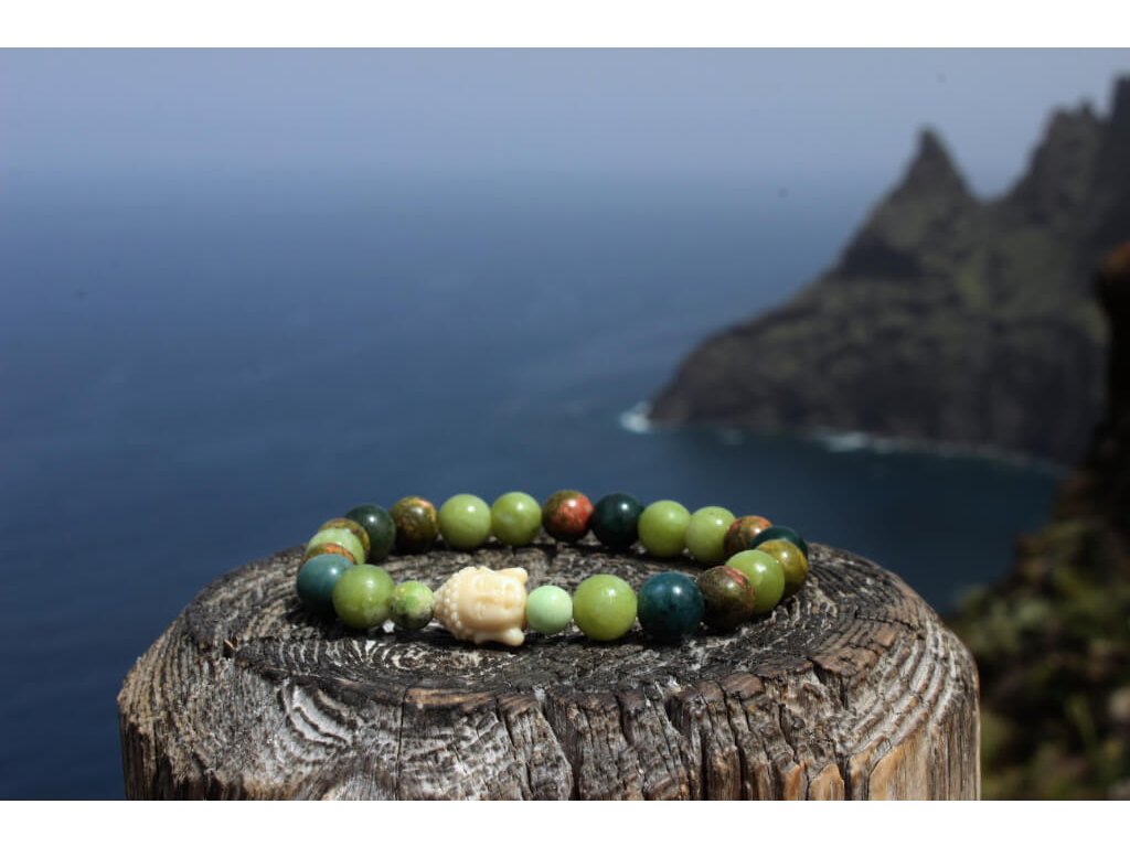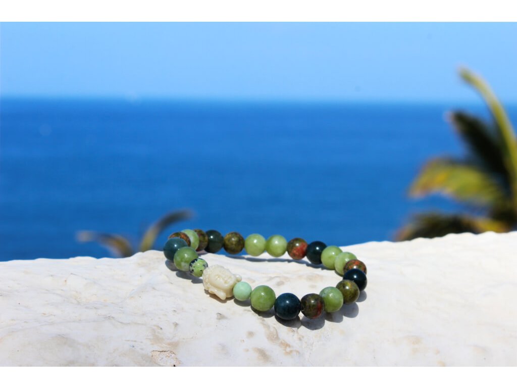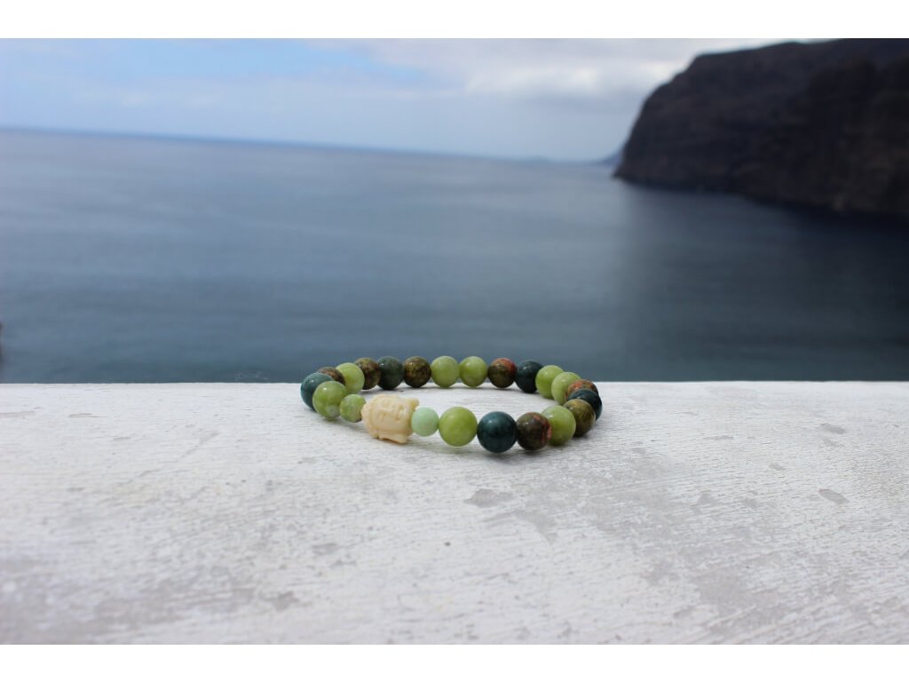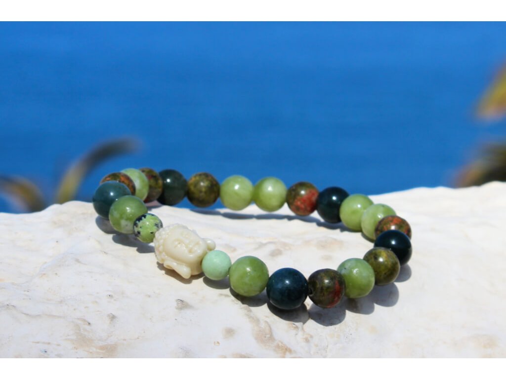 Unakit zvyšuje duchovní naladění a duševní růst, zahání smutek a pomáhá dělat kompromisy. Jaspis náleží elementu země a uvádí do rovnováhy naše city, uzemňuje a přináší stabilitu, zvyšuje duševní a citovou přizpůsobivost. Jadeit symbolizuje lásku, prosperitu, ochranu a čistotu. Přináší harmonii, štěstí a klid. Béžový korálový Buddha ztělesňuje moudrost, štěstí a osvícenost.