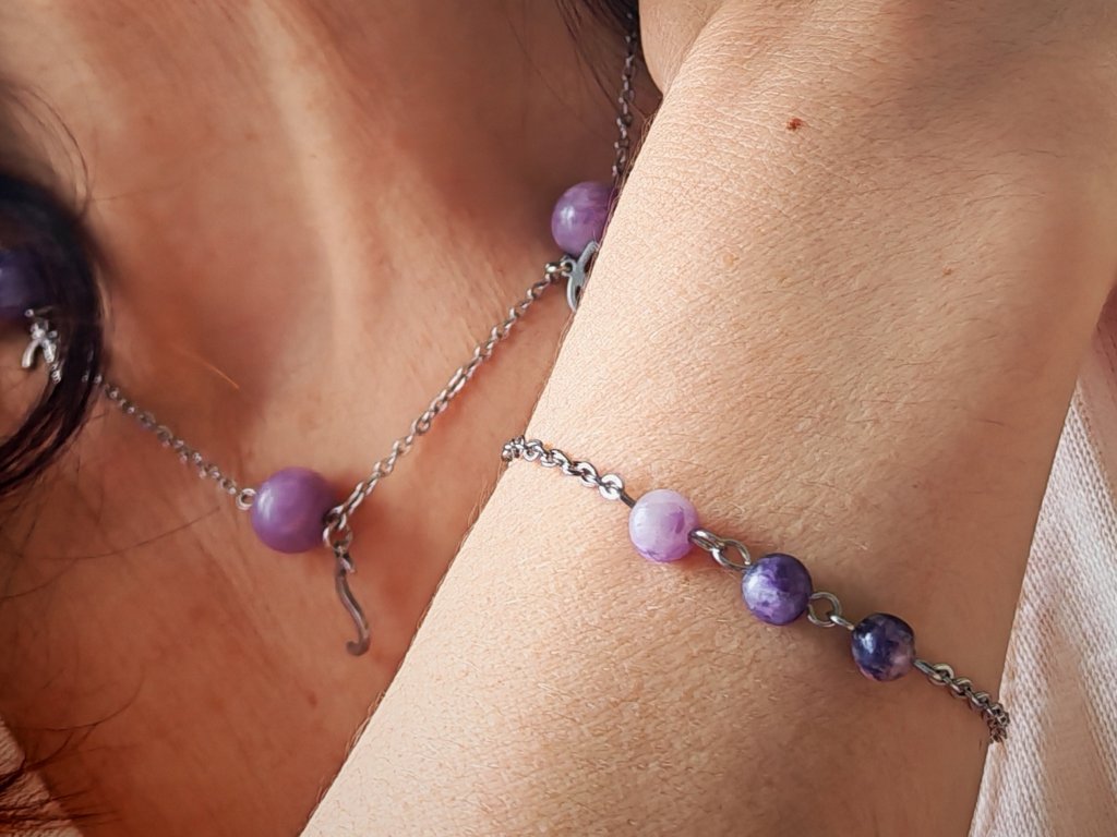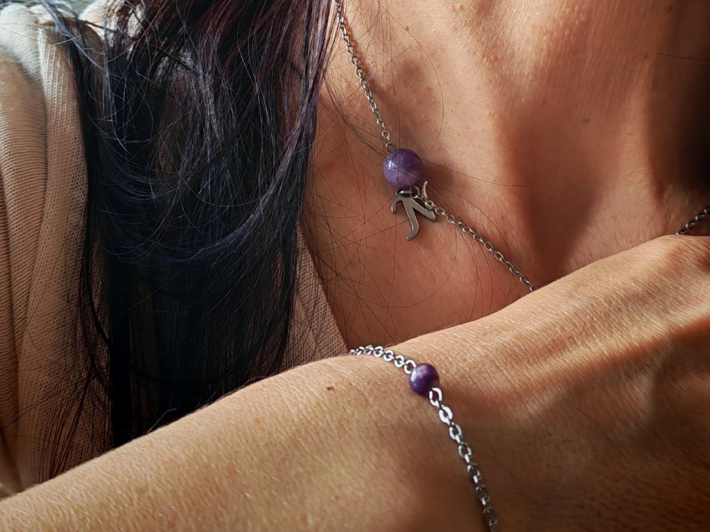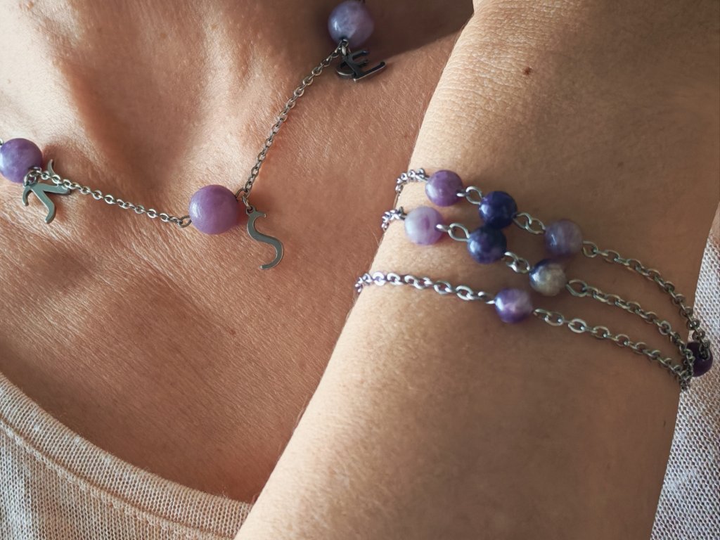 Lepidolit v něžných odstínech fialové a růžové působí jako dotek světla po dešti – jemný a něžný, ale plný hloubky. Je to kámen, který v sobě nese klid, rovnováhu a tichou sílu – a v kombinaci s chladivým leskem chirurgické oceli vytváří dokonale vyvážený kontrast mezi něžností a odolností.