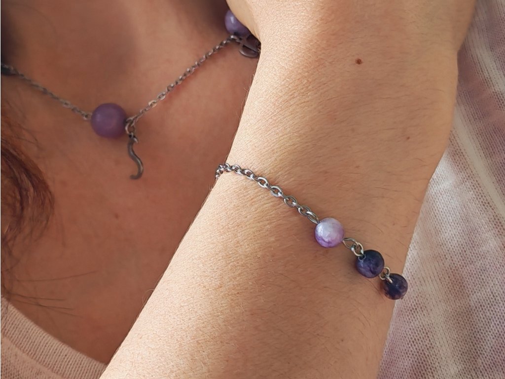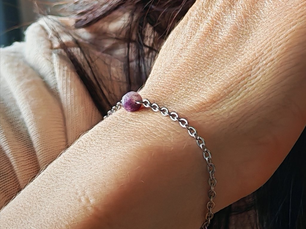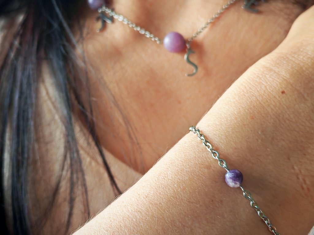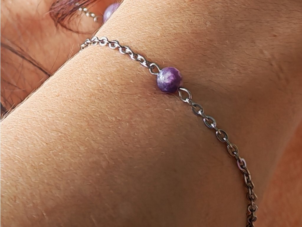 Jemný náramek z lepidolitu a chirurgické oceli. Lehký, příjemný, ladí s každodenním stylem.