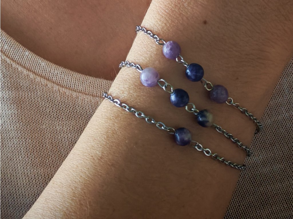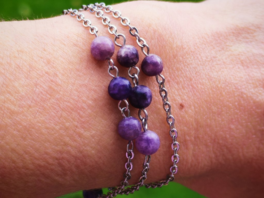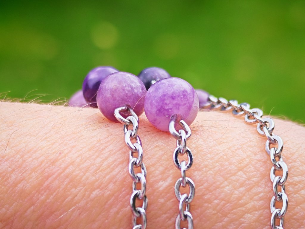 Ticho v bouři, pohled na náramek z chirurgické oceli se třemi korálky minerálu lepidolit